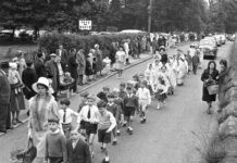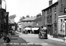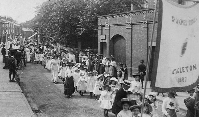 A photo of a procession (“St James 1887” says the banner, though of course that’s no indication as to the date of the event) but it is more interesting in another way. Note the bicycles and the sign you can’t read on the brick building, which indicated bicycle parking. Readers wrote in and said that this was West Street, Congleton, taken on the steps of what is now Timothy A Brown (someone suggested the Lion and Swan, too). The modern age of cycling dates closely from about then, with the coming into availability of the “Roadster” design at affordable prices, such as the two examples seen on the left. Use of such cycles became popular very quickly and became a means by which young men and women of courting age could meet much more easily. In particular, cycling was a great improvement in the liberation of respectable young women to be away from the constraints of home for a few hours. Maskery’s Café (on Swan Bank) spotted the commercial potential and provided some off-street accommodation for parking cycles to attract custom. While to women the bike offered freedom, to men (as often) it was a threat. Long dresses and bikes did not mix and the idea of a bicycle suit (basically bloomers) disturbed some men. “In particular, they saw these bicycle costumes as a physical representation of women stealing men’s characteristics, thereby blurring the lines between femininity and masculinity and what is socially acceptable for each group,” says Wikipedia. People also thought cycling would be injurious to health, not least via “bicycle face”, an expression of constant weariness and pale skin; middle-aged men could also be affected. Doctors believed that the bicycle saddle taught masturbation to women and girls, who of course never did any such thing before, and Wikipedia quotes a doctor who had spent entirely too long thinking about this. And obviously, if riding a bike is sexually arousing, the last thing parents want their daughter doing is riding off to meet a man! So much social history in one photo!