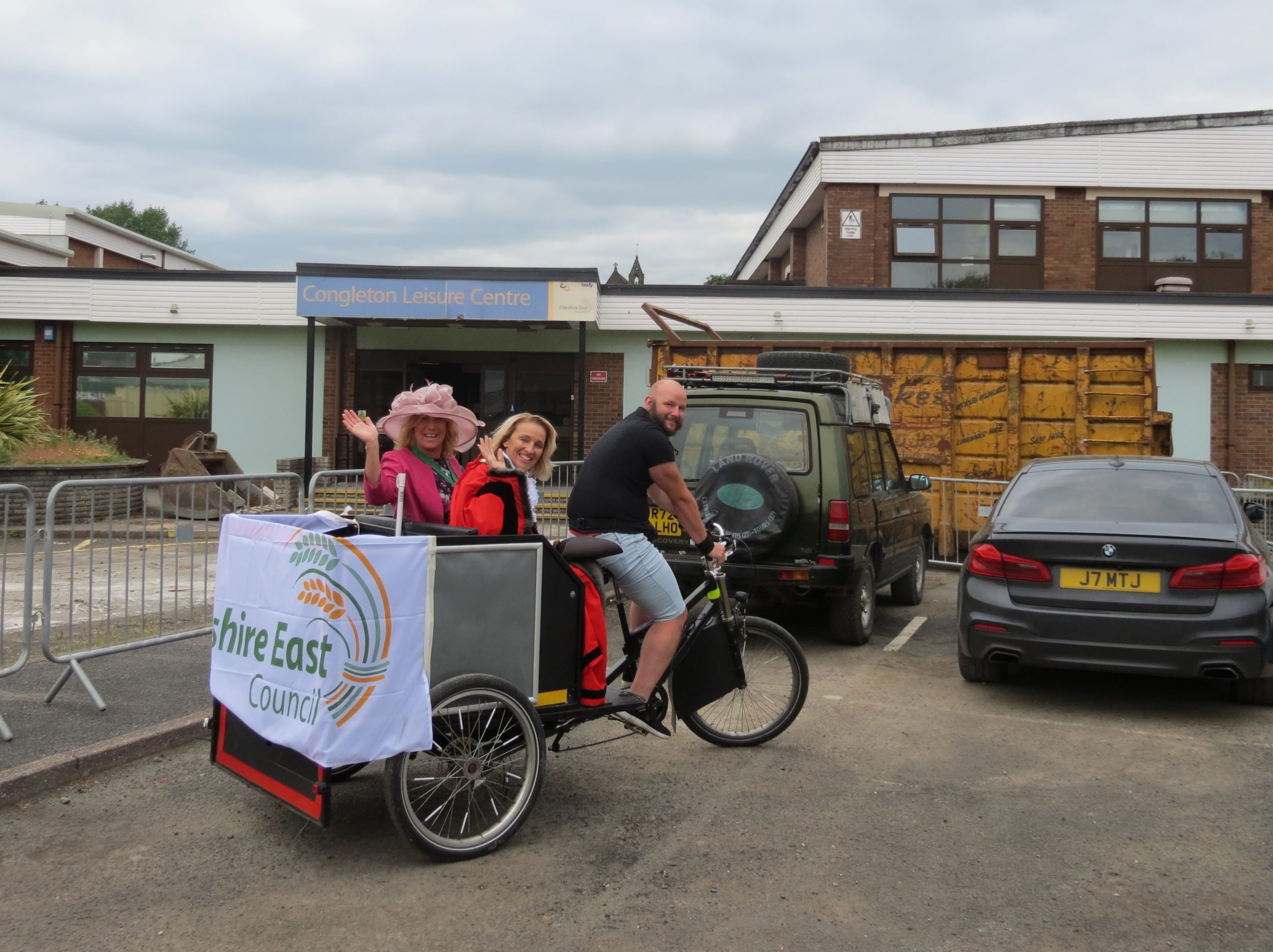 The event began with the mayor of Cheshire East Council, Coun Sarah Pochin, arriving on a rickshaw with the borough’s cycling and walking champion, Coun Suzie Akers Smith.