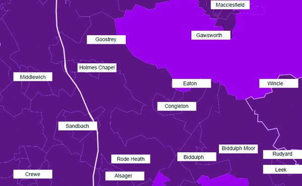 The large Cranage and Goostrey area, which runs from Cranage and down to Nick i’ th’ Hill in Congleton via Swettenham and Astbury, recorded 62 new cases, a fall of 82 over the seven days and a rolling rate down from 2,055 to 891.