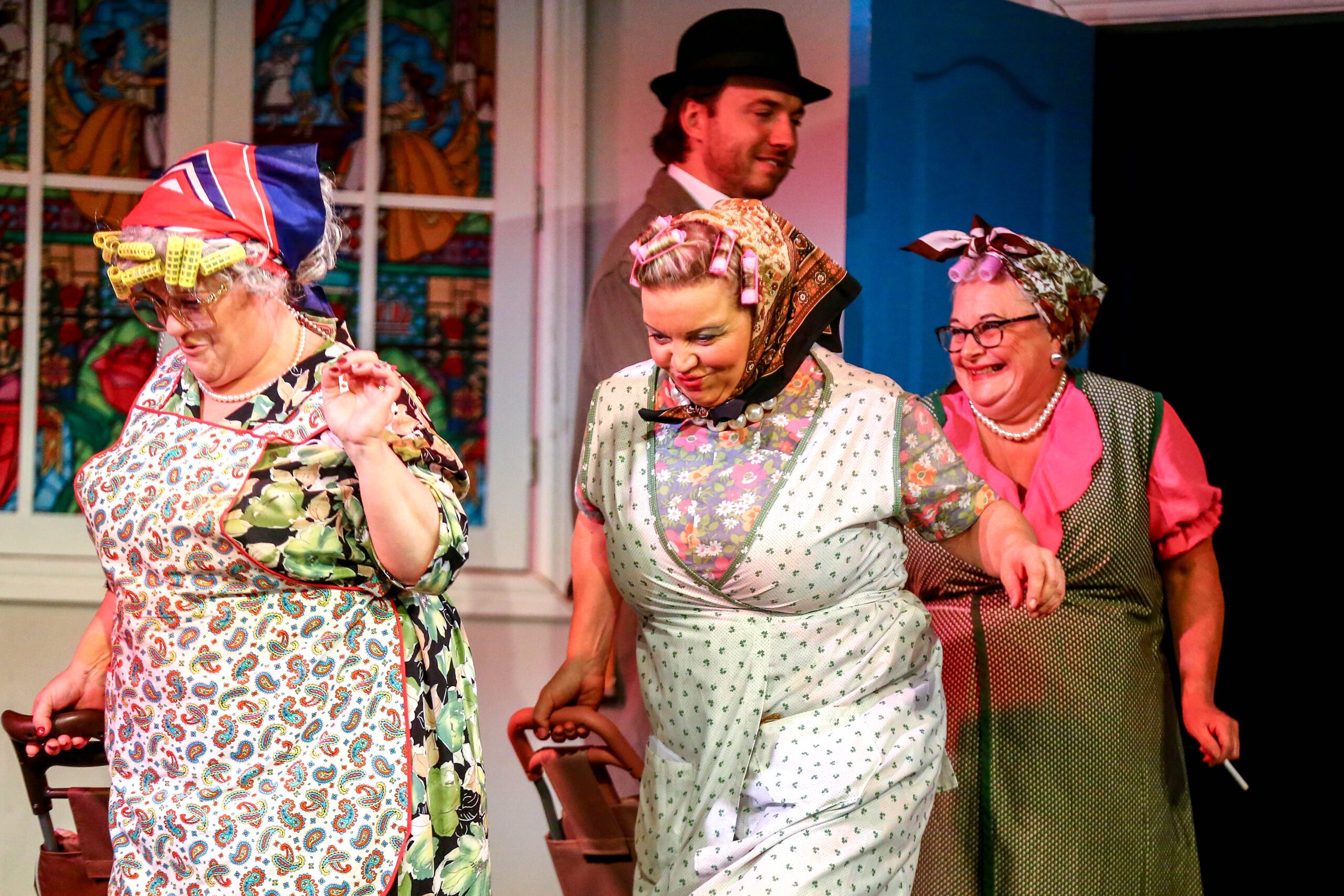 Waiter Alfie (Sam Salmon) is Victoria Wood’s “two soups” — and yes, he delivers two soups. Meanwhile, Liza Edwards, Lorraine House, and Lydia Causer play three elderly women who could be close relatives to Les Dawson’s gurning washerwomen Cissie Braithwaite and Ada Shufflebotham.