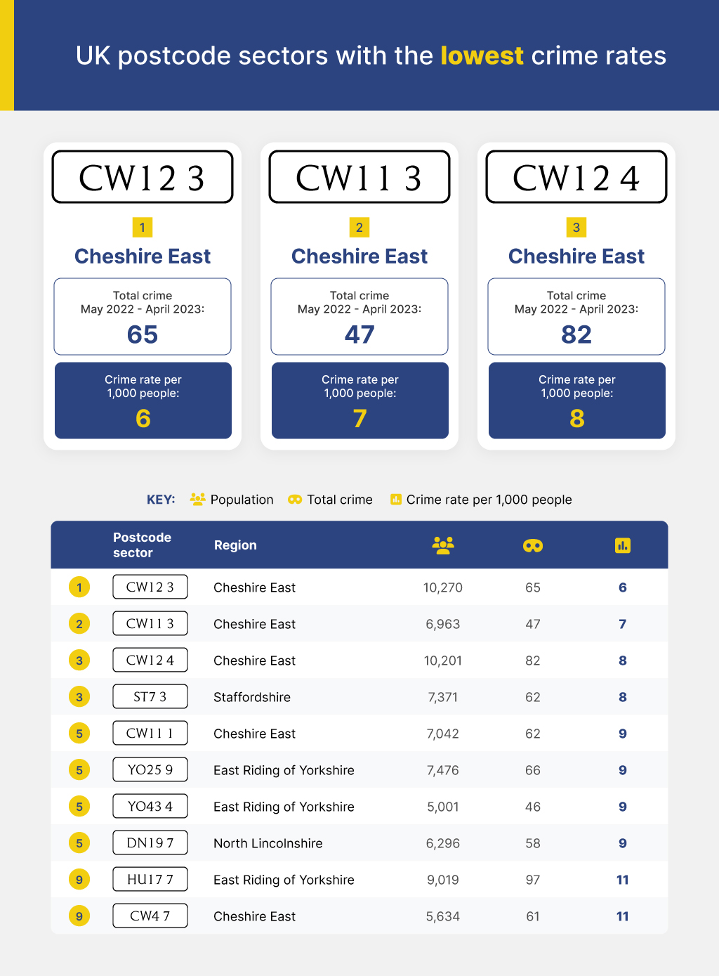 The postcode sector with the lowest crime rate in the UK was CW12 3, which covers Mossley, Hightown, Timbersbrook and Rushton. The postcode had a crime rate of six per 1,000 people – and more than 90% of these crimes were non-violent, with the vast majority being anti-social behaviour.