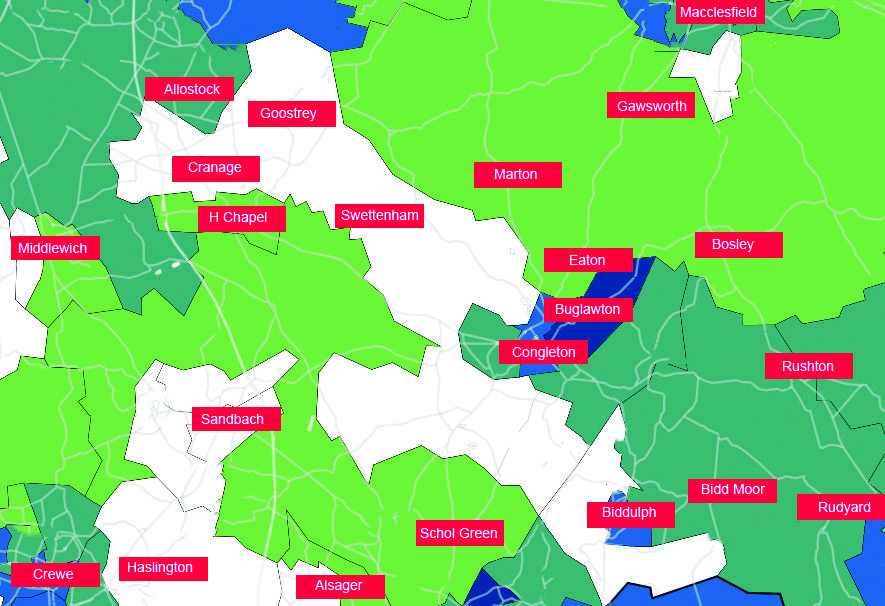 Indeed, with the exception of Eccleshall and Yarnfield, the white, fewer-than-three area now runs from Sandbach down to Highley and Ditton Priors, Bridgnorth.