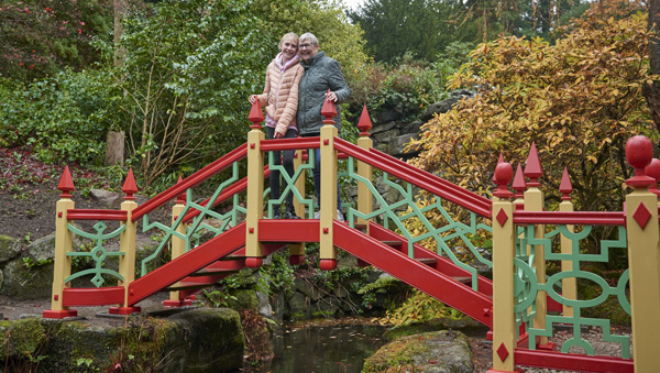 The ornate red, green and yellow footbridge, first built in the mid-19th century and replaced in the late 1980s, is a key feature of the China garden, one of a series of garden “rooms” that take visitors on a global journey. The China garden was modelled on the famous willow pattern ceramic design and is one of the garden’s most prized and photographed areas.