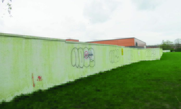 It runs virtually from the entrance to Hankinson’s Field from near the footbridge that crosses the river Dane at the park, all the way down one side of the building, except for a gap in the middle where it has been replaced with metal fencing and another for access from the field to the leisure centre/Worrall Street.