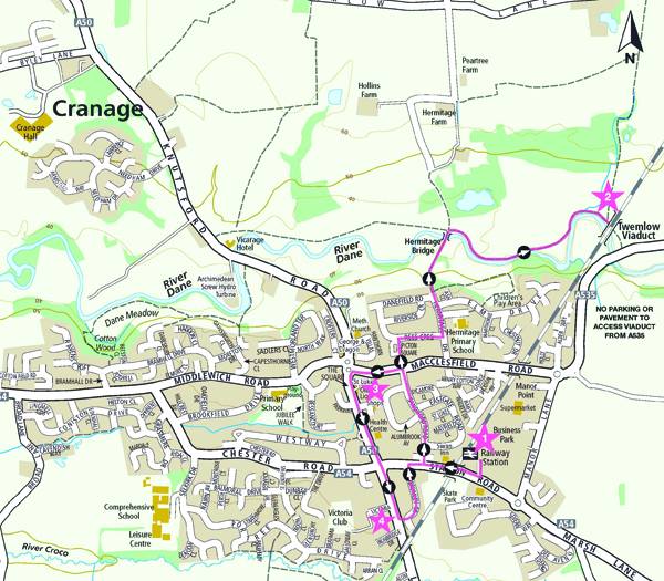 The map suggests getting to Holmes Chapel by train and starting the route at the station and heading along Station Road and Sandiford Road, heading for Hermitage Lane, crossing over Hermitage bridge and turning right onto a footpath, which follows the river Dane to the viaduct and Harry’s Wall – where Mr Styles scrawled his named during the This is Us biopic.