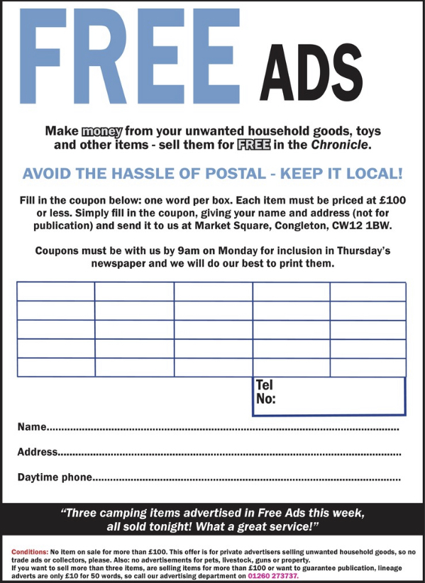 Get rid of your unwanted household goods FREE of charge. Each item must cost less than £100, and no more than 50 words/three items per entry. Coupon to cut out in this week’s paper.
