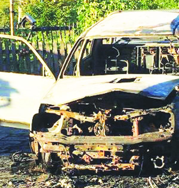 Photos showed extensive damage at the rear of the church and the burned-out vehicle.