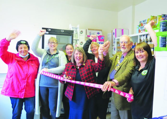 Congleton MP Fiona Bruce cut the ribbon to mark the opening on Friday in front of a backdrop of soup tins, cereal and household goods.