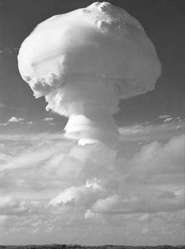 Then on the day I was instructed to enter a coconut palm grove and take a sitting position with my back against a palm tree. With hands covering eyes that were held tight shut I then, as I listened to the countdown broadcast by Tannoy, buried my face in my lap. Even so the bomb flash was so brilliant that for a second – it seemed much longer – I could see all the bones in my hands and fingers. Then came the funny few seconds having to stand and run before the bomb blast brought ripe, heavy coconuts in their copra shells raining down on one’s head.