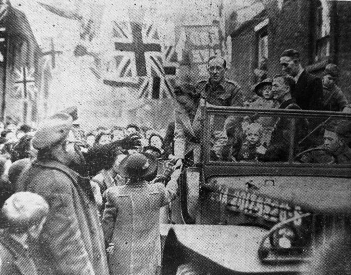 We said there were “memorable scenes” as the “gallant soldier”, wearing battle dress, and standing by his wife in an American command car, rode triumphantly through streets lined with cheering crowds to his home in Lion Street.